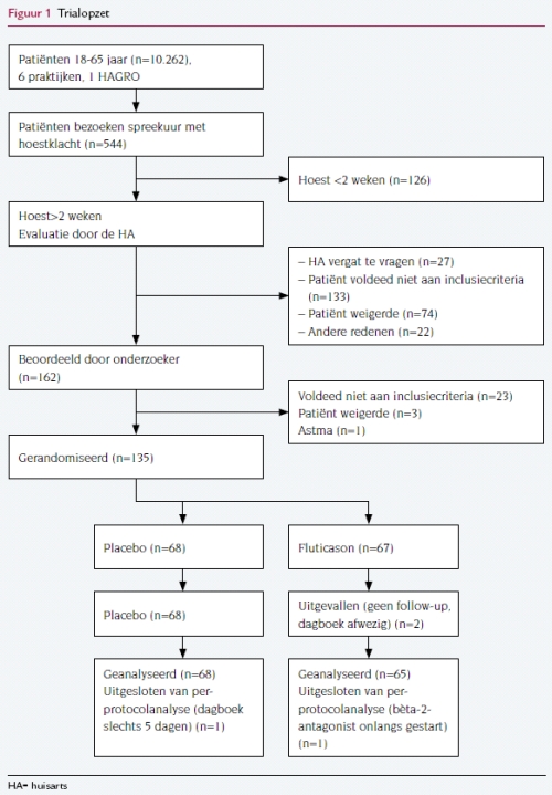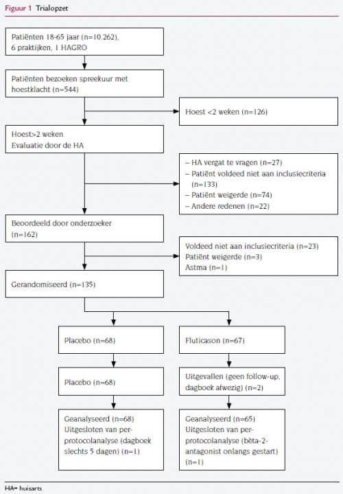 Hoesten is een van de symptomen bij aandoeningen van de lagere luchtwegen (LLW-symptomen); de andere symptomen zijn: sputumproductie, piepen op de borst, kortademigheid en vastzitten op de borst1 Wij gingen ervan uit dat inhalatiesteroïden persisterende hoestklachten bij patiënten zonder astma verminderen omdat de oorzaak van het hoesten bij patiënten met en zonder astma een grote gelijkenis vertoont.23 Hoesten en andere LLW-symptomen na een infectie met een rhinovirus komen namelijk zowel voor bij patiënten met als zonder astma.1 Bovendien kunnen niet alleen astmapatiënten, maar ook niet-atopische personen zonder astma inflammatie van de luchtwegen ontwikkelen na een virale infectie van de bovenste luchtwegen.3 Bij astmapatiënten is het effect van de ontstekingsremmer fluticasonpropionaat (FP) op hoesten en andere luchtwegsymptomen binnen 2 weken goed waarneembaar.4 Maar roken gaat dit kortetermijneffect van inhalatiecorticosteroïden tegen.5 Bij rokers met COPD en met een FEV1 van ongeveer 60% van de voorspelde waarde, leidde een viermaal daagse kuur van 1,600 µg budesonide gedurende 6 weken niet tot verbetering van de symptomen, de longfunctie of de bronchiale hyperreactiviteit.6 De incidentie van acuut hoesten, gedefinieerd als hoest die korter bestaat dan 3 weken,7 was 54 per 1000.8 Ons doel was de kortetermijneffecten van FP per inhalatie (tweemaal daags 500 µg) bij persisterend hoesten, bij overigens gezonde volwassenen, te vergelijken met placebo. Primaire uitkomstmaat was de afname in dagelijkse hoestscore gedurende de tweeweekse behandelperiode. Secundaire uitkomstmaten waren: het eigen oordeel van de patiënt over de effectiviteit van de behandeling, de behoefte aan voortzetting van behandeling na het onderzoek, ziekteverzuim, wakker worden ’s nachts, overige symptomen van de lagere luchtwegen, longfunctie en bijwerkingen. Om het werkingsmechanisme op te helderen wilden wij de invloed bepalen van roken, bronchiale hyperreactiviteit, allergie en FEV1 op de werkzaamheid van FP.