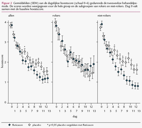 De proportie niet-rokers bij wie de gemiddelde hoestscore in de tweede week met meer dan 50% was afgenomen, bedroeg 23 op 43 (54%) in de placebogroep en 33 op 41 (81%) in de FP-groep (p=0,011). Het NNT – het aantal patiënten dat behandeld moet worden om bij één patiënt meer een hoestscorevermindering in de tweede week van ten minste 50% te verkrijgen – was 3,7. De door patiënten zelf gerapporteerde mate van verbetering was significant beter in de FP-groep dan in de placebogroep (p=0,001). Deze vergelijking apart voor rokers en niet-rokers leverde alleen een significant verschil op bij de niet-rokers (p=0,004). De klinische relevantie, gemeten aan de hand van de wens van de deelnemers om verder behandeld te worden na afloop van de trial, was als volgt: van de patiënten in de FP-groep wenste 43% (28/65) voortgezette medicamenteuze behandeling na de 2 weken onderzoeksmedicatie; bij de patiënten in de placebogroep was dit 63% (42/67) (p=0,036). Deze percentages bedroegen voor niet-rokers respectievelijk 39% en 68% (p=0,014) en 50% en 54% voor rokers. We vonden geen significante verschillen tussen placebo en FP in het effect op werkverzuim, ’s nachts wakker worden, symptomen van de onderste luchtwegen (behalve hoest en sputum), rhonchi, FEV1 en PD20. De gemiddelde dagscore voor sputum ophoesten (0–3) in de tweede week van de behandeling was 0,3 punt lager bij patiënten met FP dan in de placebogroep (p