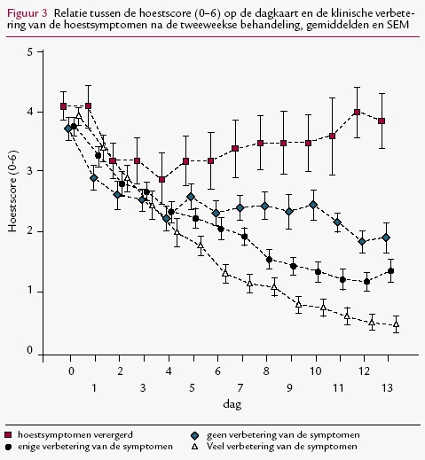 In de FP-groep daalde de gemiddelde hoestscore van 3,8 bij de baselinemeting naar 1,4 ± 0,2 SEM gedurende de tweede week van de behandeling, en in de placebogroep respectievelijk van 3,8 naar 1,9 ± 0,1. Het verschil tussen de twee groepen was significant (p=0,012). Wanneer we rekening hielden met bronchiale hyperreactiviteit, roken en de baseline hoestscore, liet ANCOVA een gemiddelde dagelijkse hoestscore in de tweede week van de behandeling zien die 0,5 punt (95%-BI 0,1-0,9) lager was in de FP-groep dan in de placebogroep. Uit nadere analyse bleek het verschil tussen FP en placebo significant af te hangen van roken (effectmodificatie: p=0,015); bronchiale hyperreactiviteit en baseline hoestscore beïnvloedden het behandeleffect niet. Analyse van de niet-rokers (64% van de patiënten) liet zien dat bij deze groep de gemiddelde dagelijkse hoestscore in de tweede week 0,9 punt (95%-BI 0,4–1,3) lager was dan in de placebogroep. Dit behandeleffect was niet significant gecorreleerd aan de baseline hoestscore. Per dag bekeken was het verschil tussen beide onderzoeksgroepen significant vanaf dag 5 bij de niet-rokers (figuur 2). Bij de rokers was bij de patiënten die FP inhaleerden de gemiddelde hoestscore in de tweede week 0,1 punt hoger (95%-BI –0,6-0,9) dan bij rokers uit de controlegroep (figuur 2). Het effect van FP op de reductie in hoestscore werd verder niet significant beïnvloed door bronchiale hyperreactiviteit; dit gold zowel voor rokers als voor niet-rokers.