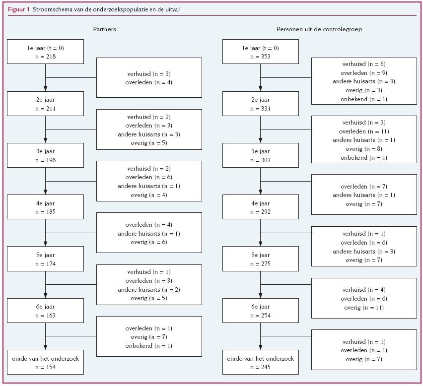 De karakteristieken van de partners van de dementiepatiënten zijn opgenomen in tabel 1. Deze partners hadden een gemiddelde leeftijd van 76,2 jaar (range 54-93, SD 7,3) en ruim 60% was vrouw. Wij volgden de partners gemiddeld 4,78 jaar vanaf de diagnose. Vierenzestig (29%) van hen overleden of verlieten de huisartsenpraktijk voor het einde van de onderzoeksperiode (zie figuur). Gedurende de follow-upperiode bezochten 10 partners (5%) hun huisarts niet.