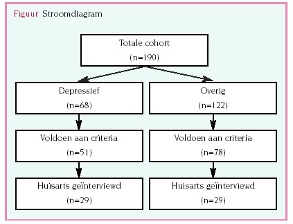 In totaal voldeden 129 patiënten aan deze criteria ( figuur). Van hen werden er 51 op enig moment gedurende de follow-upperiode depressief bevonden. Van 22 van deze 51 patiënten werd de huisarts niet geïnterviewd: bij 9 patiënten weigerden de huisartsen medewerking en van 13 waren de huisartsen bij herhaling niet beschikbaar voor het interview. Het ging in totaal om 10 verschillende huisartsen: 1 was inmiddels gepensioneerd, 2 waren ziek, 1 was van baan veranderd, 1 verbleef langdurig in het buitenland en 5 waren er bij herhaling niet voor de onderzoeker bereikbaar of beschikbaar. Hierdoor bleven er 29 patiënten over voor deelname aan het onderzoek.