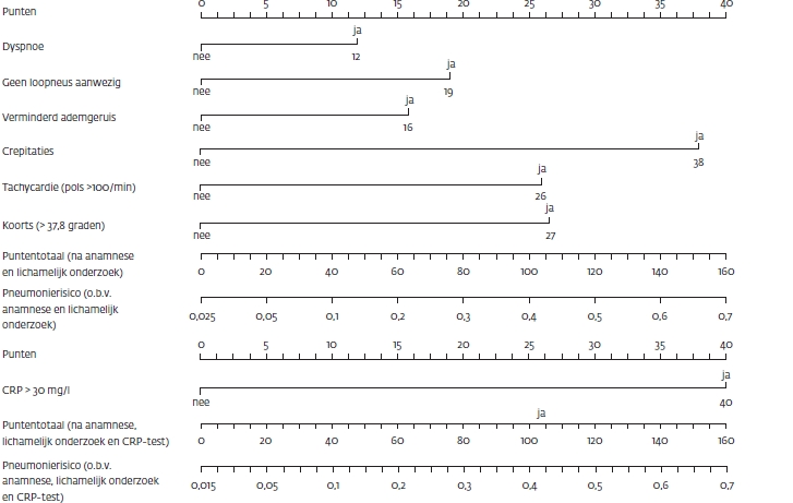 Het betreft een scoresysteem op basis van anamnese, lichamelijk onderzoek en CRP (optimaal afkappunt 30 mg/l) om het risico op pneumonie te voorspellen bij iedere patiënt die met hoestklachten op het spreekuur komt. De huisarts moet alle items van anamnese en lichamelijk onderzoek scoren (op aan- of afwezigheid) en dan optellen. Dit puntentotaal correspondeert met een pneumonierisico dat de huisarts kan aflezen. Indien een CRP-test volgt, kan de huisarts ook deze punten bij de score optellen, om hiermee vervolgens opnieuw het pneumonierisico te bepalen. Het donkere gebied op de eerste ‘pneumonierisico-as’ laat zien voor welke patiënten de toegevoegde waarde van een CRP-test het grootst is. Ter illustratie twee voorbeelden: een eerste patiënt komt met hoestklachten op het spreekuur en heeft geen loopneus (19 punten) of dyspneu (0 punten). Bij onderzoek is er koorts (27 punten) en hoort de huisarts verminderd ademgeruis (16 punten) en crepiteren (38 punten). Dit geeft een totaalscore van 100, wat overeenkomt met een pneumonierisico van 40%. Dit ligt buiten het donkere gebied op de as en daarom is een CRP-test niet nodig. Bij een tweede patiënt met hoestklachten is sprake van dyspneu (12 punten) en tachycardie (26 punten): een totaalscore van 38, wat een pneumonierisico van ongeveer 0,07 (7%) geeft. Dit ligt in het donkere gebied van de risico-as, dus luidt het advies een CRP-test te doen. Als de CRP-waarde hoger is dan 30 mg/l (40 punten), is de nieuwe score 38 + 40 = 78 punten, wat correspondeert met een pneumonierisico van 15%. Als de CRP-waarde lager is dan 30 mg/l (0 punten), dan zou de puntenscore 38 blijven en zou daarmee het pneumonierisico minder dan 5% zijn.