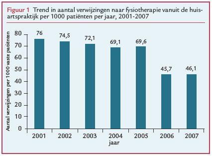 Sinds 2006 is fysiotherapie toegankelijk zonder verwijzing. Uit onderzoek van het Landelijk Informatievoorziening Paramedische Zorg (LIPZ) blijkt dat in 2006 28% van de patiënten gebruikmaakte van de directe toegang fysiotherapie (DTF). Jongeren, hoger opgeleiden, patiënten met kortdurende en/of recidiverende klachten en patiënten met (lage)rug- of nekklachten maakten relatief vaker gebruik van DTF. De vraag is of het aantal verwijzingen door de huisarts naar de fysiotherapeut is afgenomen en of huisartsen hierdoor minder patiënten met klachten aan het bewegingsapparaat zien. Wij onderzochten dit met gegevens uit LINH over de jaren 2001 tot 2007.