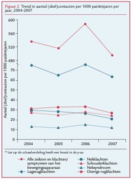 Uit de gegevens van LIPZ blijkt dat patiënten relatief vaak zonder tussenkomst van de huisarts de fysiotherapeut bezoeken met rug-, nek en schouderklachten. Men kan daarom verwachten dat de huisarts minder van deze klachten ziet in de praktijk. Dit is onderzocht door voor 2004-2007 het aantal contacten met deze specifieke klachten en het totaal aantal klachten/symptomen van het bewegingsapparaat te berekenen. Het aantal contacten laat voor de meeste gezondheidsklachten geen duidelijk dalende trend zien (figuur 2). Het aantal contacten laat, met uitzondering van de nekklachten, zelfs een stijging zien in 2006. In 2007 daalt het aantal deelcontacten echter. Voor nekklachten wordt wel een lichte daling in het aantal (deel)contacten gezien.