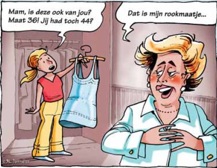 De redenen om weer met roken te beginnen zijn al even bont. Zo staat mij een ochtend in het geheugen gegrift dat een (niet-rokende) vader met zoon aan mijn bed verschenen. Gijsje had een bosje bloemen in zijn hand en formuleerde voorzichtig het verzoek van beide heren of ik alsjeblieft weer wilde gaan roken. Ze vonden me dan veel liever. Verder waren er de gebruikelijke smoezen. Stress, ja. Dat gezellige feestje. En het naïeve ‘ik ben nu al zo lang gestopt, dat ene sigaretje zal nu wel geen kwaad meer kunnen’. Ook deed elke stoppoging mij van een slanke den in een forse eik veranderen. Als ervaren stopper wist ik dat ik alleen maar weer hoefde te gaan roken en al die gehate kilo’s zouden gestaag en volkomen vanzelf weer verdwijnen. In de loop der jaren heb ik die metamorfoses heen en weer zo vaak doorgemaakt, dat ik in mijn kast complete garderobes heb in de maten 36 tot en met 44. En de concentratieproblemen en het daarmee gepaard gaande geheugenverlies waren ook al een regelrechte ramp. Kortom, ik stak er nog maar eentje op.