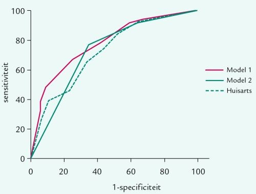 De prospectieve benadering impliceerde dat alle casus werden geanalyseerd, inclusief achteraf gebleken relatief zeldzame aandoeningen zoals een buitenbaarmoederlijke zwangerschap en een molazwangerschap. Op basis van klachten en symptomen stelden we twee diagnostische modellen op met behulp van logistische regressie. Model 1 voorspelt het al dan niet aanwezig zijn van een vitale zwangerschap, model 2 het al dan niet aanwezig zijn van een complete miskraam. We kozen voor deze diagnosen omdat de huisarts dan een afwachtend beleid kan volgen en echoscopie, de gouden standaard voor het stellen van de diagnose, geen therapeutische consequentie heeft. De samenhang tussen patiëntkarakteristieken, klinische variabelen en diagnostische bevindingen bij gynaecologisch onderzoek werden allereerst geanalyseerd in een univariate regressieanalyse. Alle potentieel diagnostische variabelen met een p-waarde = 0,10 werden geselecteerd en beoordeeld op multicollineariteit (onderlinge afhankelijkheid) (Pearson correlatiecoëfficiënt, drempel 0,4). Bij multicollineariteit werd gekozen voor de variabele met de hoogste klinische face validity en/of de variabele die in de eerste lijn het gemakkelijkst kan worden bepaald. Er werd een multivariaat model ontwikkeld (afkappunt p=0,05). Met de variabelen die in de multivariate regressieanalyse werden vastgesteld als onafhankelijke voorspellers werd een zogenaamde ROC-curve ( receiver operating characteristic) geconstrueerd, die de relatie tussen sensitiviteit en specificiteit weergeeft bij verschillende afkappunten voor elk model. We beschouwden het afkappunt met de laagste som van fout-positieve en fout-negatieve diagnosen als optimaal, waarbij we gelijk gewicht toekenden aan fout-positieve en fout-negatieve diagnosen. Tevens vergeleken we de diagnostische mogelijkheid van model 1 met de inschatting van de huisartsen op de aanwezigheid van een vitale zwangerschap. Voor de analyses maakten we gebruik van versie 9.0 van SPSS.