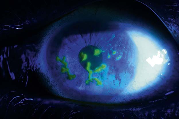 De huisarts kan een typische dendritische HSV-keratitis zelf behandelen.