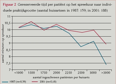De afgelopen decennia is de spanning tussen vraag en aanbod naar huisartsenzorg toegenomen. Terwijl het gemiddelde aantal contacten van Nederlanders met hun huisarts in de periode 1987-2001 met bijna 10% is toegenomen, ging het gemiddeld aantal arbeidsuren van huisartsen (ook bij ‘voltijders’) flink omlaag ( figuur 1). Huisartsen zijn dus meer contacten gaan verwerken in minder tijd. Betekent dit nu dat er minder tijd voor de patiënt op het spreekuur overblijft dan voorheen? Blijkbaar niet: in figuur 2 is te zien dat in 1987 het aantal minuten dat een huisarts per patiënt reserveerde sterk afnam naarmate de praktijk groter was. Dit patroon is er in 2001 nog steeds, maar in veel mindere mate. De hoeveelheid tijd voor een patiënt op het spreekuur is dus minder afhankelijk geworden van het aantal ingeschreven patiënten per huisarts. De correlatie tussen het aantal ingeschreven patiënten en het aantal minuten voor een patiënt op het spreekuur is gehalveerd: van 0,39 naar 0,18. Eenzelfde ontwikkeling is te zien in de relatie tussen het aantal uren patiëntenzorg en de praktijkgrootte. De afhankelijkheid tussen de praktijkgrootte en de hoeveelheid tijd die een huisarts aan patiëntenzorg besteedt en voor een consult uittrekt, bestaat weliswaar nog steeds, maar is beduidend kleiner. Een verklaring zou kunnen liggen in de afname van het aantal huisvisites in deze periode (van ongeveer 16% naar 9% van de contacten) en de toename van het aantal telefonische consulten (van ruim 4% naar bijna 12%); zo houden huisartsen immers meer tijd over voor het spreekuur. Een andere verklaring zou kunnen zijn dat de huisartsen met grote praktijken op andere terreinen efficiënter zijn gaan werken, bijvoorbeeld door meer tijdrovende taken te delegeren.