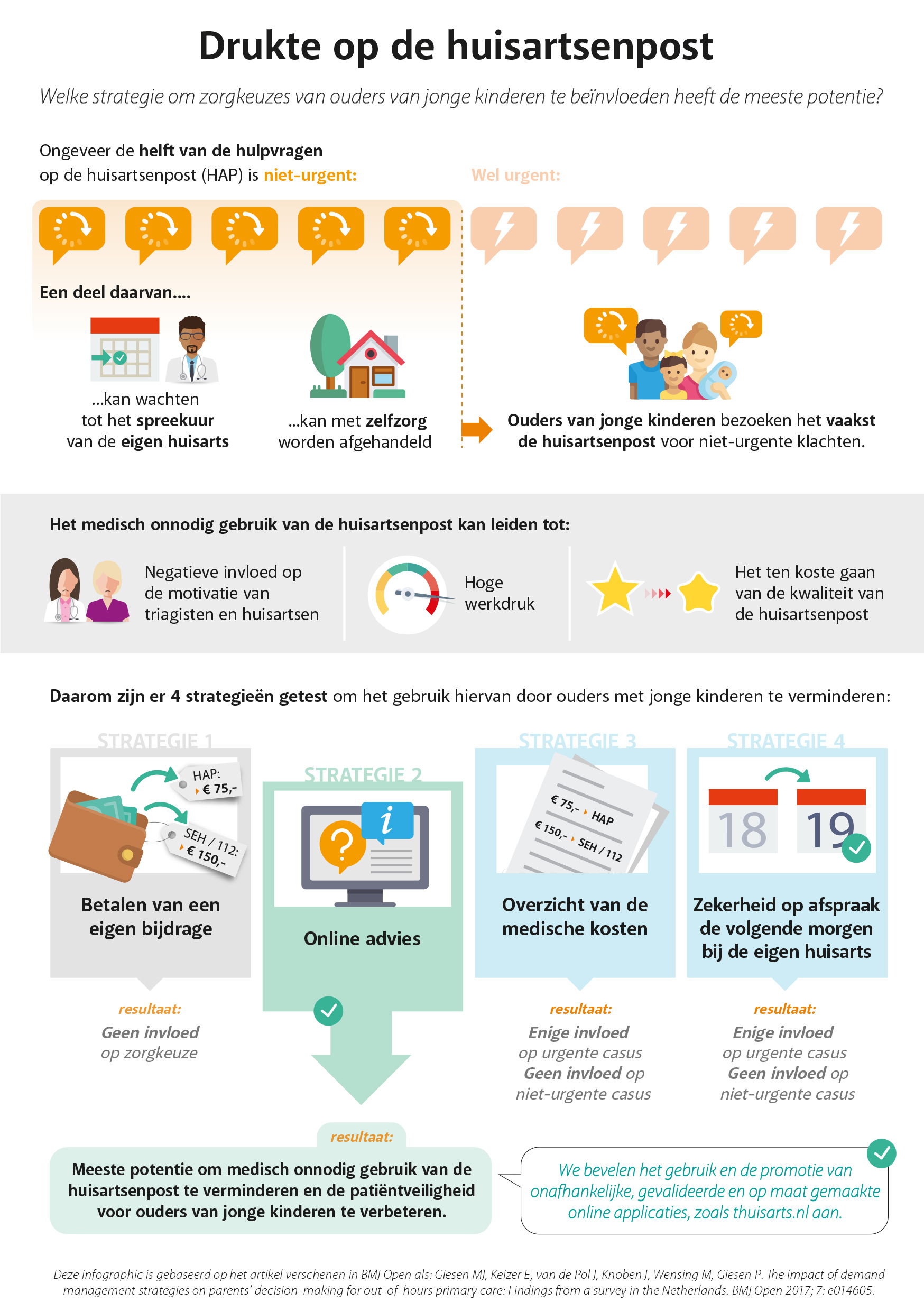 Deze infographic is gebaseerd op het artikel verschenen in MBJ Open als: Giesen MJ, Keizer E, van de Pol J, Koben J, Wensing M, Giesen P. The impact of demand management strategies on parents' decision-making for out-of-hours primary care: Findings from a survey in the Netherlands. BMJ Open 2017; 7: e014605.