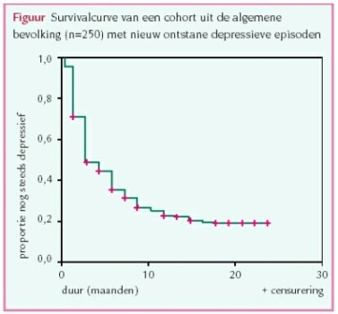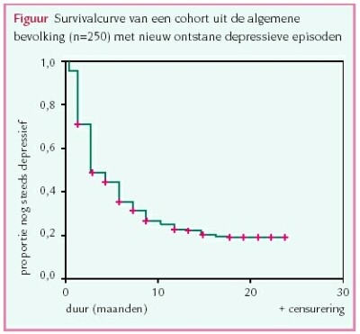 Spijker J, Bijl RV, Nolen WA. Duur van depressieve episoden en voorspellers van hun beloop. Resultaten van NEMESIS. Huisarts Wet 2004;47(2):70-3. Doel Kennis van de duur van depressieve episoden en determinanten van hun beloop is voor de huisarts van belang bij het geven van een prognose. Onderzoeksresultaten uit NEMESIS (Netherlands Mental Health Survey and Incidence Study) geven hiervoor de nodige informatie. Methode NEMESIS is een prospectief epidemiologisch onderzoek onder volwassenen (n=7076), met de C omposite international diagnostic interview (CIDI) als diagnostisch instrument. Het beloop werd vastgesteld met een Life Chart Interview en de duur van episoden werd berekend met survivalanalyse. Resultaten De mediane duur van (op)nieuw ontstane depressieve episoden (volgens DSM-III-R) is 3 maanden. Chroniciteit (duur van depressie van 2 jaar of meer) ontstaat bij 20% van de personen met een depressieve episode. De beste voorspellers voor het persisteren van een depressie zijn ziektekenmerken als de ernst van de depressie en een langere duur van eerdere episoden. Verder zijn ook eerdere (chronische) lichamelijke aandoeningen en gebrek aan sociale steun van invloed. Conclusies Bij depressies met een duur langer dan drie maanden is het risico op een chronisch beloop aanzienlijk. Het is daarom belangrijk om de bestaande duur en overige prognostische kenmerken voor chroniciteit mee te laten wegen in de indicatiestelling voor behandeling.