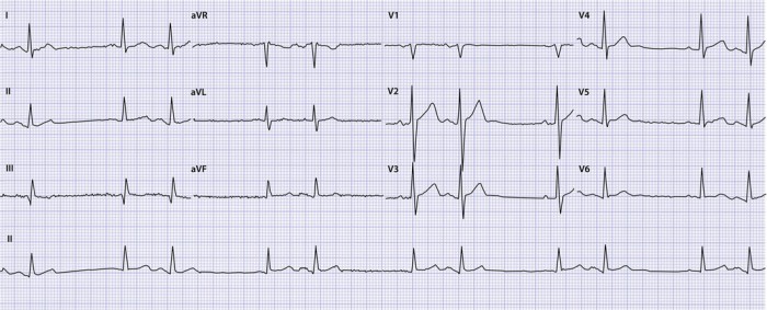 Voorgeschiedenis: Hypertensie, STEMI, waarvoor hij 5 jaar eerder een stent in de rechter kransslagader heeft gekregen, hartfalen met verminderde ejectiefractie (LVEF 36%), AAA, waarvoor 3 jaar eerder endovasculair een prothese is geplaatst, een nierfunctiestoornis (G3a A1, eGFR 47 ml/min/1,73 m2) en sinds 10 jaar paroxysmaal atriumfibrilleren.