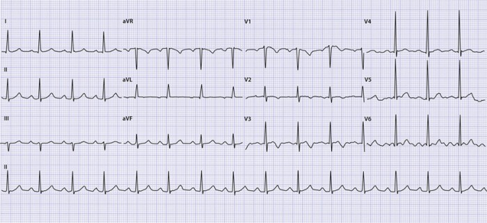 Vanwege de actuele pijn op de borst met vegetatieve verschijnselen en hypotensie vraagt de huisarts direct om een ambulancespoedrit. De ambulanceverpleegkundige maakt onder meer een ecg.