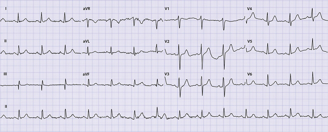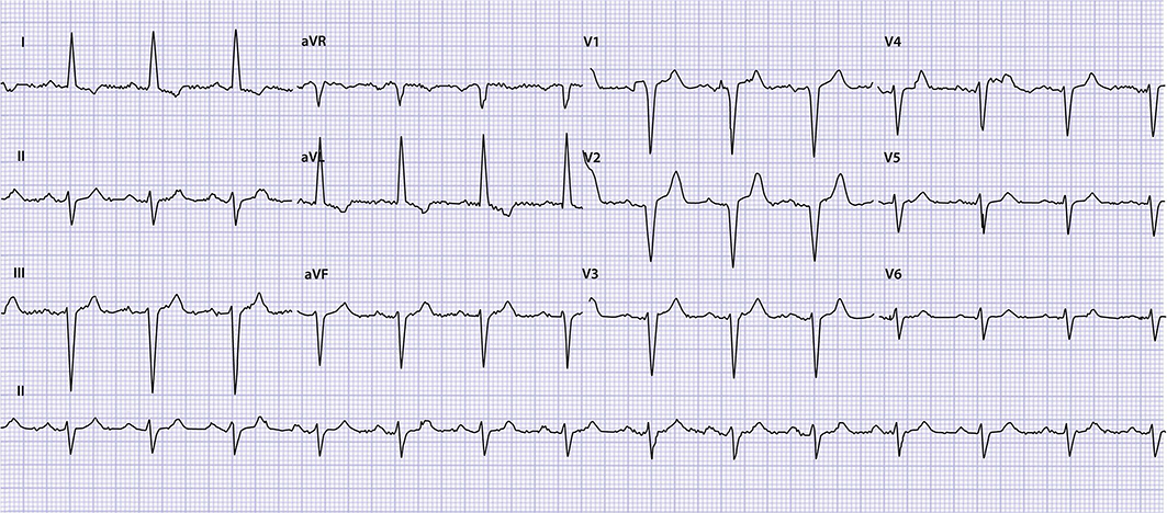 De huisarts denkt aan bloedarmoede, een obstructief longprobleem (astma of COPD) of cardiale problemen met hartfalen. Ze verricht oriënterend bloedonderzoek, inclusief BNP-bepaling en gezien het mogelijke hartfalen ook meteen een ecg. Nier- en levertests, Hb en vitaminestatus tonen geen afwijkingen. De NT-proBNP-waarde is met 80 pmol/l verhoogd (normaalwaarde < 15 pmol/l).