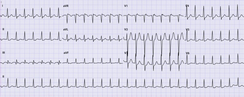 3. P-top | De P-top, die normaal voor het QRS-complex ligt en meestal in II en in V1 goed zichtbaar is, is hier niet te vinden. De P-top is echter niet afwezig, de P-top ligt aan het einde van het QRS-complex. In V1 is dat goed te zien. De P is positief in avR en avL.