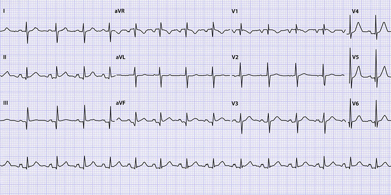 Desondanks zijn kliniek en ecg voldoende reden voor nadere analyse op de spoedeisende hulp. Een longembolie wordt met een CT-scan uitgesloten. Een echocardiografie diezelfde middag toont geen structurele hartafwijkingen, zoals cardiomyopathie. De patiënt blijft nog drie dagen ter analyse. Er blijkt sprake van een forse hyperthyreoïdie. Na behandeling normaliseert uiteindelijk het ecg. Deze casus toont dat een ecg lang niet altijd een specifieke diagnose oplevert, maar wel kan helpen bij het triëren. Vooral als er in deze casus een duidelijke ritmestoornis was gevonden waren de klachten te verklaren geweest. Nu was dat niet het geval en was er alle reden voor nadere spoedanalyse.