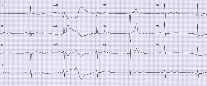 Lichamelijk onderzoek: Bloeddruk 138/86 mmHg, pols 44/min, regulair. Saturatie 98%. Temperatuur 37,1 ° C. Hart: normale tonen, geen souffle. Longen: symmetrisch, vesiculair ademgeruis zonder bijgeluiden. Enkels: geen oedeem, symmetrisch.