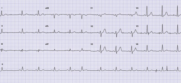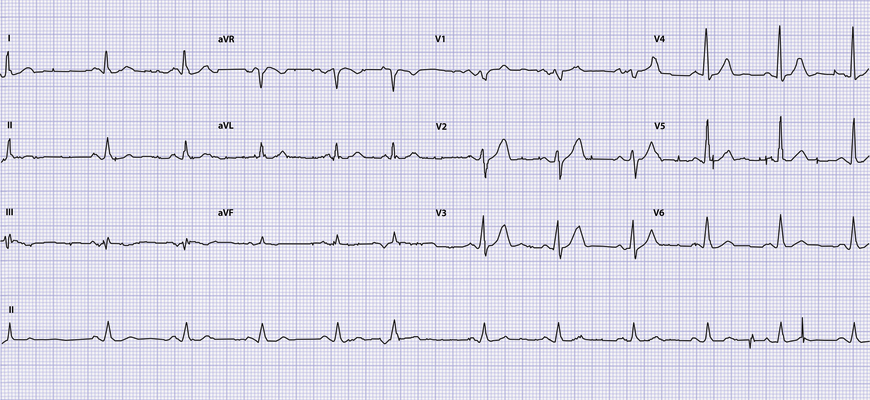 Lichamelijk onderzoek: De patiënt is niet ziek en er zijn geen vegetatieve verschijnselen. Polsfrequentie 84/min, irregulair. Bloeddruk 136/80.
