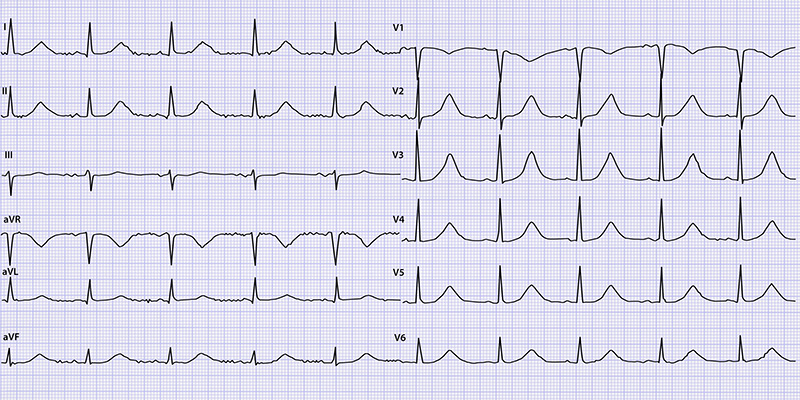 Lichamelijk onderzoek: Bij beiden geen afwijkingen bij oriënterend hart- en longonderzoek. Normale bloeddrukken, geen extra harttonen, geen souffles. De 24-jarige vrouw heeft een normaal ecg. Hier staat het ecg van de 22-jarige man.