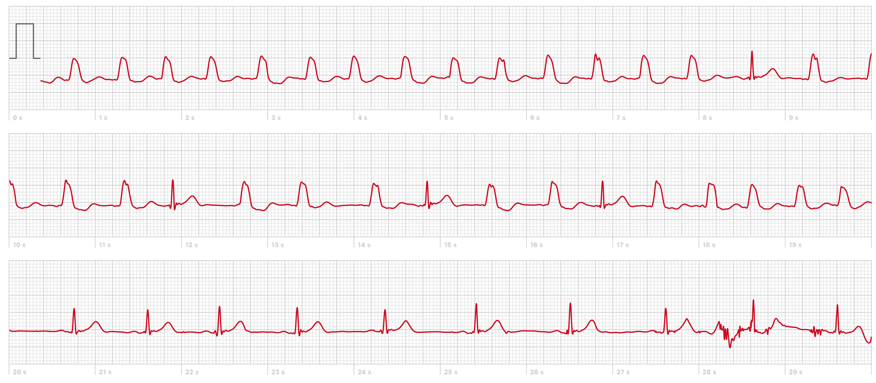 Anamnese: De patiënt heeft af en toe hartkloppingen die vooral optreden in stressvolle periodes en hooguit enkele minuten aanhouden. Hij voelt op die momenten zelf een snelle en onregelmatige pols van ongeveer 150/min. Hij ervaart tijdens de aanvallen geen andere klachten, zoals duizeligheid of pijn op de borst. Buiten de aanvallen is hij volledig klachtenvrij. De patiënt heeft een ‘smartwatch’ waarmee hij een 1-afleiding-ecg-registratie kon maken van 1 van zijn aanvallen met hartkloppingen. Hij schrikt ervan en pleegt direct overleg met een bevriende cardioloog.