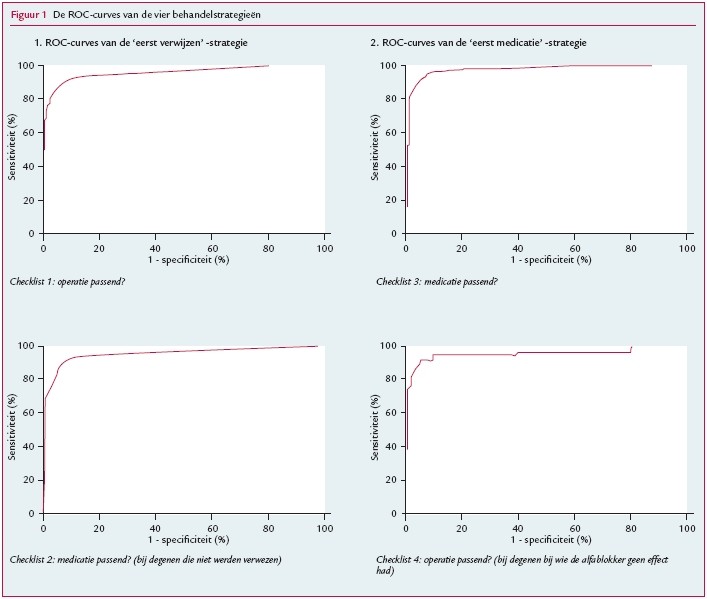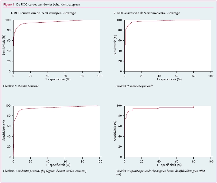 Aan de hand van de expertoordelen uit de onderzoeken van Stoevelaar5 en McDonnell6 bepaalden wij voor ieder lid van onze onderzoekspopulatie of de specialist zou kiezen voor een operatie dan wel een alfablokker. Vervolgens construeerden we logistische regressiemodellen om dit oordeel te kunnen voorspellen op basis van eerstelijnsgegevens (we gebruikten dus de tweedelijnsgegevens om het oordeel van de specialist te bepalen en de eerstelijns gegevens om dat oordeel te voorspellen). We berekenden de zogeheten ‘receiver operating characteristic’ (ROC) van deze modellen en de bijbehorende ‘area under the curve’, en transformeerden de modellen ten slotte tot simpeler checklists. Deze procedure voerden wij tweemaal uit. De eerste keer volgden we een ‘eerst verwijzen’-strategie: we construeerden het model om te bepalen wie verwezen zou moeten worden en daarna wie van de overigen in aanmerking zou komen voor een alfablokker. De tweede keer volgden we een ‘eerst medicatie’-strategie: nu bepaalden we eerst wie in aanmerking kwam voor een alfablokker en daarna bij wie – als deze therapie zou falen – verwijzing aangewezen zou zijn. Nadat we de regressiemodellen aldus tot vier checklists hadden teruggebracht, berekenden we – bij wijze van voorlopige inschatting – de sensitiviteit, specificiteit en positief voorspellende waarde van die checklists. Hier staat ‘sensitiviteit’ voor het percentage mannen dat volgens de checklists in aanmerking zou komen voor verwijzing dan wel medicatie en ook daadwerkelijk verwezen wordt of medicatie krijgt. ‘Specificiteit’ staat dan voor het percentage mannen dat geen van de genoemde behandelingen krijgt en daarvoor volgens de checklists ook niet in aanmerking komt. De positief voorspellende waarde is het percentage verwezen mannen voor wie operatie dan wel medicatie inderdaad een passende behandeling bleek. We wilden onze checklists in eerste instantie een zo hoog mogelijke sensitiviteit geven en achtten daarom de specificiteit en de positief voorspellende waarde van minder groot belang. De huisarts heeft immers een belangrijke functie als poortwachter en mag daarom de patiënt een potentieel nuttige behandeling niet onthouden. De uroloog zal altijd nader onderzoek doen (echo, uroflowmetrie, urodynamisch onderzoek) en daarbij de indicatie strikter stellen, zodat er geen gevaar is voor overbehandeling. Bij alfablokkers geldt een vergelijkbare redenering. De richtlijnen stellen dat – als de arts twijfelt over de behandeling – een proefbehandeling met evaluatiemoment passend is. De huisarts moet dus die patiënten uitfilteren voor wie een behandeling met een alfablokker zinvol zou kunnen zijn, accepterend dat zo’n proefbehandeling voor sommigen later minder nuttig zal blijken.
