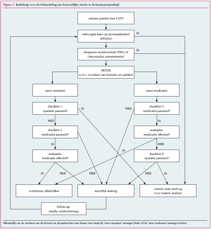 Patiënten gaan doorgaans af op de informatie die de huisarts hun geeft. Deze informatie is bij voorkeur gebaseerd op gerandomiseerd klinisch onderzoek met harde eindpunten in een vergelijkbare populatie en onder vergelijkbare omstandigheden; met andere woorden: op wetenschappelijk onderzoek uitgevoerd in de eerste lijn. Wij zijn van mening dat – bij gebrek aan dergelijk onderzoek – onze benadering de ‘next best’ is: zij maakt de gegeven informatie in ieder geval rationeel en transparant, en dat zijn de basisvoorwaarden van adequate voorlichting. Ons onderzoek toont aan dat een op consensus gebaseerde richtlijn kan worden vertaald in een simpel, praktisch instrument voor de eerste lijn. De checklists voorspellen de behandelinfawijze van de uroloog goed. Uroflowmetrie voegt er te weinig aan toe om het gebruik ervan in de eerste lijn op dit moment sterk te bevorderen. De twee benaderingen die wij analyseerden, zijn in beginsel gelijkwaardig en allebei evenzeer verdedigbaar. Onze resultaten suggereren echter dat de ‘eerst medicatie’-strategie de verstandigste is: deze garandeert het meest efficiënte gebruik van alfablokkers als proefbehandeling, zoals de richtlijnen ook aanbevelen.3