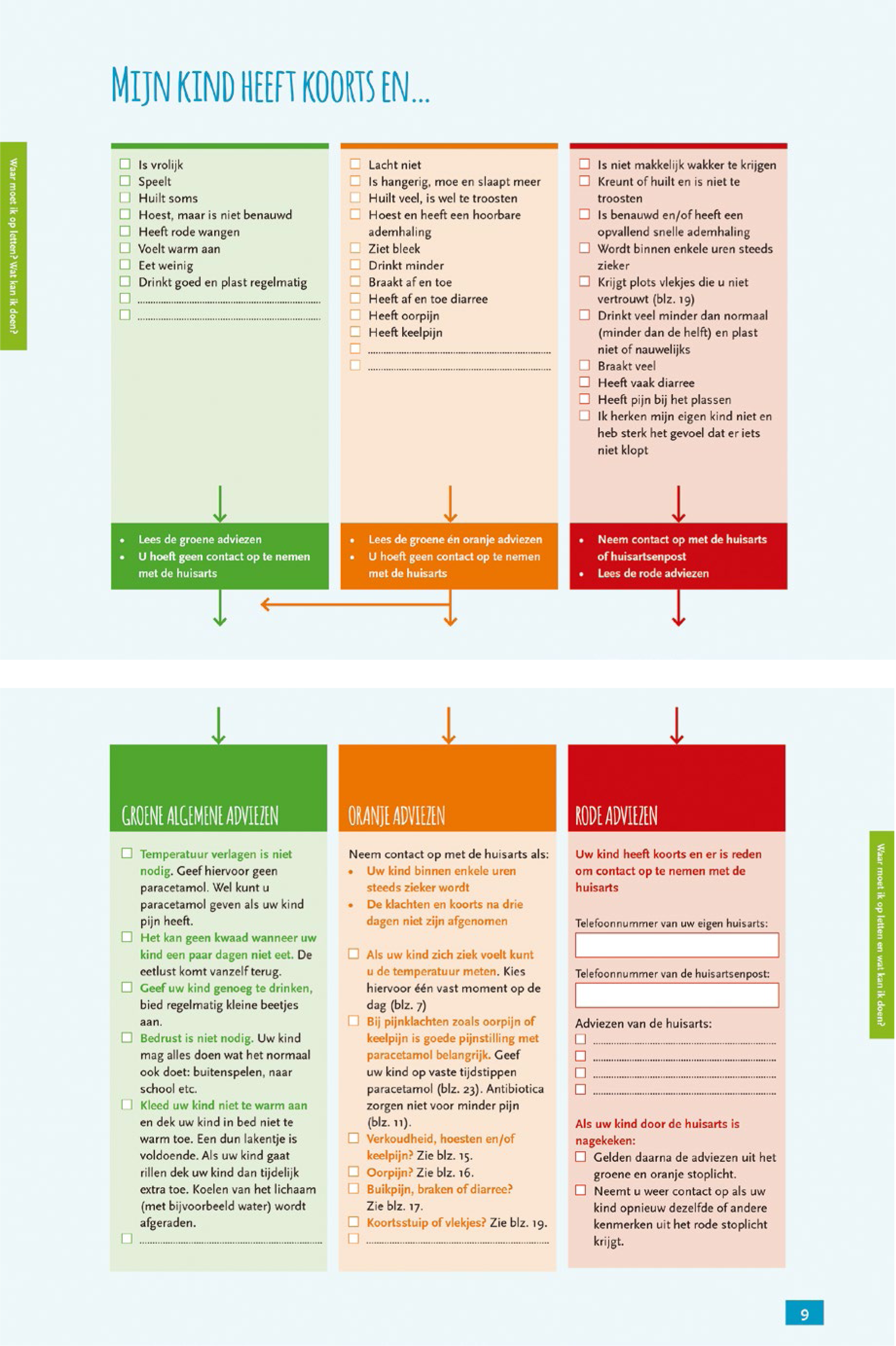 een stoplichtsysteem voor koorts bij kinderen in het algemeen en voor specifieke infectieklachten zoals hoest, keelpijn, oorpijn, buikpijn, braken en diarree, waarin gedrag en symptomen die de ouders zelf konden observeren werden gekoppeld aan adviezen in oplopende urgentie [figuur 2];