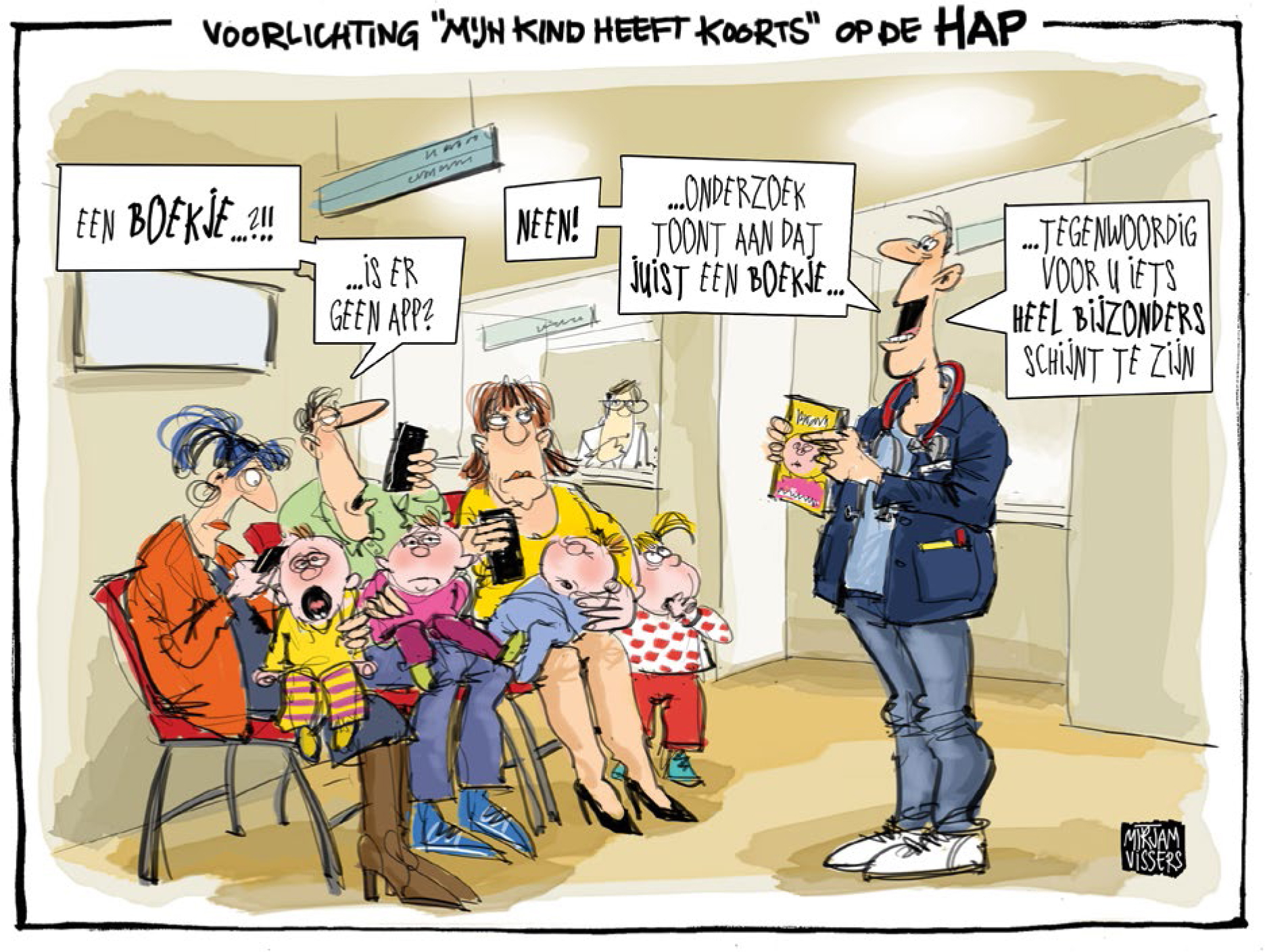 Onze bevindingen wijzen erop dat het belangrijk is dat HAP’s gaan nadenken over een combinatie van voorlichtingsboekjes met digitale informatie via Thuisarts.nl, met online nascholing voor de dienstdoende huisartsen en met bijvoorbeeld reminders in de vorm van posters. De vraag is of dat dan alleen moet gaan over koorts bij kinderen en niet meteen ook over digitale of schriftelijke informatie in het algemeen. In onze aanvullende analyse bleek dat kinderen bij wie het boekje werd gebruikt vergelijkbaar waren met kinderen bij wie het boekje niet werd gebruikt. Het enige verschil was dat het boekje vaker gebruikt leek te worden wanneer de huisarts niet een specifieke diagnose noteerde, maar koos voor de algemene ICPC-code A03 (koorts).
