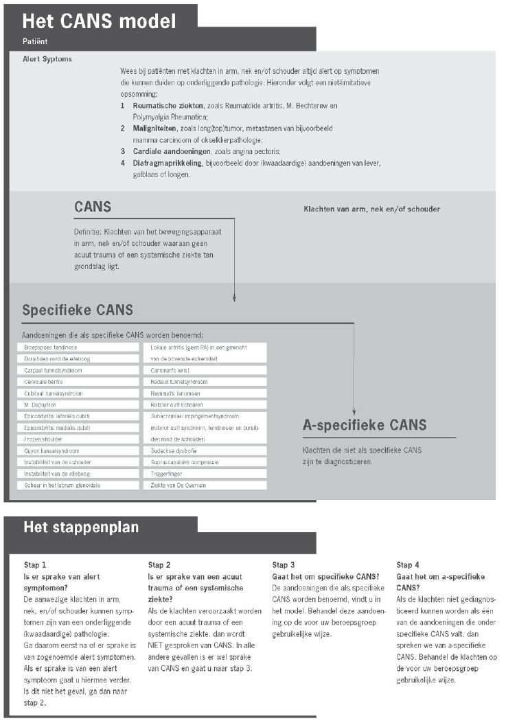 Het CANS-model, een consensusmodel waaraan deskundigen uit 11 beroepsgroepen bijdroegen, biedt een uniforme terminologie en indeling voor klachten van het arm-, nek- en schoudergebied, die de verwarrende term ‘RSI’ overbodig maakt. Het model onderscheidt specifieke en aspecifieke CANS. Tot de specifieke CANS behoren 23 met name genoemde aandoeningen.