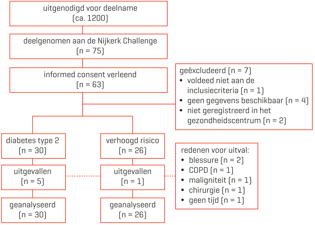 Van de ongeveer 1200 mensen die werden uitgenodigd voor het programma hebben er 76 meegedaan aan de Nijkerk Challenge. Van 56 deelnemers konden we de gegevens analyseren, 30 met diabetes type 2 en 26 met een verhoogd risico [figuur].