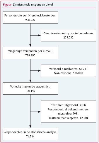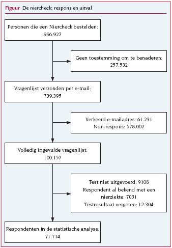 Het aantal mensen met cardiometabole aandoeningen, zoals hart- en vaatziekten en diabetes mellitus, stijgt aanzienlijk in welvarende landen.12 Daarmee neemt de behoefte toe om deze aandoeningen vroegtijdig op te sporen en te behandelen, zodat de patiënt toekomstige problemen – en de gezondheidszorg de daarmee gepaard gaande kosten – zo veel mogelijk bespaard blijven. Het screenen van de algemene bevolking wordt dan ook steeds populairder. In 2006 startte Nierstichting Nederland de campagne ‘Stop beginnende nierziekte’, die tot doel had mensen met een verhoogd risico op chronische nierinsufficiëntie op te sporen. Dit gebeurde met de Niercheck, een gratis zelftest op albuminurie. Chronische nierinsufficiëntie is een aandoening waarbij de nieren onvoldoende werken en afvalstoffen zich in het lichaam ophopen. De ziekte kan resulteren in uitval van de nierfunctie en uiteindelijk levensbedreigend worden, zodat hemodialyse of niertransplantatie noodzakelijk zijn.3 Deze nierfunctievervangende behandelingen zijn niet alleen zeer ingrijpend voor de patiënt maar ook erg kostbaar: de totale jaarlijkse kosten in Nederland bedragen momenteel ongeveer 400 miljoen euro, exclusief de kosten van complicaties en ziekenhuisopnames.4 Chronische nierinsufficiëntie gaat tevens gepaard met een verhoogde cardiovasculaire morbiditeit en mortaliteit.5 De eerste stadia van chronische nierinsufficiëntie verlopen vaak zonder symptomen en het is dan ook lastig de ziekte vroegtijdig op te sporen.3 Een van de indicatoren voor een verslechterde nierfunctie en een verhoogd risico op chronische nierinsufficiëntie is een verhoogd eiwitgehalte in de urine (albuminurie). Voor patiënten met een albumineconcentratie van meer dan 200 mg/l (macroalbuminurie) is het risico dat zij binnen vijf tot vijftien jaar nierfunctievervangende therapie nodig zullen hebben driemaal verhoogd.6 Als men echter vroeg genoeg begint, kan een behandeling met angiotensineconverterendenzymremmers of angiotensinereceptorblokkers de nierfunctie langer in stand houden en nierdialyse uitstellen of zelfs voorkomen.78 Omdat een nierziekte grote gevolgen heeft voor de patiënt, aanvankelijk symptoomloos verloopt en er een goede behandeling beschikbaar is, zou een bevolkingsonderzoek naar beginnende nierziekte te rechtvaardigen zijn volgens de criteria van Wilson en Jungner.9 Nierstichting Nederland bood in haar campagne een gratis zelftest op albuminurie aan: de Niercheck. Mensen zijn in toenemende mate geïnteresseerd in hun gezondheid en zelftests worden steeds populairder. Een Engels onderzoek vond in 2006 op het internet 104 zelftests voor 24 aandoeningen, waaronder kanker en chronische ziekten.10 Een zelftest stelt iedereen in staat om zonder de hulp van een professional informatie te vergaren over de eigen gezondheidstoestand. Aan zelftests kleven echter ook bezwaren, met als belangrijkste het grote aantal foutpositieve testresultaten, die leiden tot onnodige diagnostiek, kosten, medicalisering en zorgen voor de patiënt. Wij onderzochten in hoeverre de Niercheck bruikbaar was als screeningsinstrument voor de algemene bevolking. Onze onderzoeksvragen waren: wat zijn de kenmerken van de personen die deze zelftest aanvroegen, hoevelen van hen hadden een positieve testuitslag, hoevelen bezochten een huisarts na een positieve zelftest en hoeveel nieuwe gevallen van chronische nierinsufficiëntie of risicofactoren daarvoor (hypertensie en diabetes) kwamen dankzij de campagne aan het licht?
