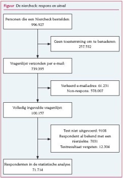 Tijdens de eerste maand van de campagne werden meer dan een miljoen albuminetests aangevraagd. Van de 71.714 respondenten op onze vragenlijst rapporteerde 79% een negatieve, 20% een zwak positieve en 1% een sterk positieve testuitslag. Van de positieve testers bezocht 25% een huisarts en was 31% van plan dit op een later moment nog te doen. In de groep van 3983 respondenten die de huisarts bezochten, werd bij 193 een aandoening of risicofactor opgespoord. De in dit onderzoek gebruikte dipsticktest onderscheidde slechts vier albumineconcentraties (0, 30, 100 of 500 mg/l), waardoor het onderscheid tussen microalbuminurie (20-200 mg/l) en macroalbuminurie (> 200 mg/l) moeilijk te maken is.11 De groep testers met een sterk positieve testuitslag (> 100 mg/l) zal voornamelijk personen met macroalbuminurie omvatten. Dit wordt ondersteund door de bevinding dat het percentage sterk positieve testers in ons onderzoek vergelijkbaar is met de in andere onderzoeken gevonden prevalenties van macroalbuminurie: 1,3% in de Verenigde Staten12 en 0,6% in Nederland.13 Het percentage zwak positieve testuitslagen (20%) dat wij vonden is daarentegen zeer hoog. Het is aannemelijk dat dit voor een aanzienlijk deel foutpositieve uitslagen waren, veroorzaakt door een verkeerde uitvoering of een fout bij het aflezen. Veel deelnemers hebben de dipsticktest waarschijnlijk afgelezen bij kunstlicht en niet bij daglicht. Wij hebben deze hypothese getest door de relatie te onderzoeken tussen het aantal zwak positieve uitslagen en duisternis in de vroege ochtenduren (resultaten niet weergegeven). Het percentage zwak positieve uitslagen bleek inderdaad hoger te zijn in de winter. Een positief resultaat van de campagne is het grote aantal aangevraagde zelftests. Men mag aannemen dat de campagne in de Nederlandse bevolking heeft geleid tot een groter bewustzijn aangaande het risico van nierziekten. Bovendien heeft de campagne niet alleen nieuwe gevallen van chronische nierinsufficiëntie aan het licht gebracht, maar ook mensen met diabetes en hypertensie opgespoord die daardoor een verhoogd risico op chronische nierinsufficiëntie hadden. De campagne had echter ook een aantal negatieve aspecten. Het relatief grote aantal zwak positieve testuitslagen bevat naar alle waarschijnlijkheid flink wat foutpositieve uitslagen. Dat zorgt voor onnodige bezorgdheid onder de zelftesters, stimuleert daarmee onnodig gebruik van de gezondheidszorg en verhoogt dus onnodig de kosten daarvan. De priorkans op chronische nierinsufficiëntie in de algemene bevolking is, bij een prevalentie van ongeveer 1%, niet groot en de diagnostische waarde van de gebruikte dipsticktest is beperkt, dus ook bij een positieve testuitslag is de posteriorkans op de ziekte slechts klein. In die omstandigheden is het beter om niet de algemene bevolking te screenen, maar populaties met een hoog risico zoals mensen met hypertensie of diabetes. Een laatste overweging is dat driekwart van de positieve testers niet met de uitslag naar de huisarts stapte, al hebben sommigen dat later misschien alsnog gedaan. De redenen voor dit hoge percentage zijn overigens onduidelijk. Wij vonden de laagste percentages positieve testuitslagen in de oudere leeftijdsgroepen, ondanks de hogere prevalenties van cardiovasculaire risicofactoren en diabetes in deze groepen. Dit is niet in overeenstemming met de elders gerapporteerde leeftijdsspecifieke prevalentie van macroalbuminurie.12 Het suggereert dat de Niercheck is aangevraagd door relatief ongezonde jonge mensen en relatief gezonde ouderen. Oudere mensen met chronische ziekten worden waarschijnlijk al regelmatig gecontroleerd door de huisarts. Bovendien zijn oudere mensen minder vertrouwd met internet en/of hebben minder toegang tot internet. Voor het opsporen van jongeren met een verhoogd risico op (chronische) ziekten zou een zelftest via het internet dus een goede methode kunnen zijn. Ons onderzoek heeft een aantal beperkingen. Ten eerste zijn de resultaten gebaseerd op zelfgerapporteerde gegevens van de deelnemers. Het was niet mogelijk om de zelfgerapporteerde diagnoses van nierziekten, hart- en vaatziekten en diabetes te valideren, en dat gold ook voor de testuitslagen. Ten tweede was de respons op de vragenlijst slechts 13,5%. Wij weten niet of de groep respondenten representatief is voor de totale groep aanvragers van een Niercheck. Het is mogelijk dat juist personen bij wie de zelftest positief was, extra gemotiveerd waren om de vragenlijst in te vullen. Aan de andere kant was het percentage sterk positieve testers vergelijkbaar met de prevalentie van macroalbuminurie in andere onderzoeken,1213 wat een selectieve respons minder waarschijnlijk maakt. De efficiëntie van landelijke zelftestcampagnes zou kunnen worden verhoogd door het testen in te bedden in de reguliere zorg, bijvoorbeeld de huisartsenpraktijk. Dit zou het aantal foutpositieve resultaten kunnen reduceren en het mogelijk maken mensen met een positieve testuitslag adequate zorg te bieden. Het aantal foutpositieve testresultaten kan worden verminderd door te testen in een populatie met een hogere priorkans op albuminurie, zoals patiënten met hypertensie en/of diabetes, en door de uitvoering van de test over te laten aan een zorgverlener. In de zelftestcampagne bleken relatief veel deelnemers met een positieve testuitslag toch niet naar de huisarts te gaan. Ook dit vermindert de efficiëntie van de campagne, want deze mensen krijgen niet de behandeling die nodig is om een toekomstige nierziekte te voorkomen. Samenvattend kunnen wij concluderen dat het aanbieden van een gratis zelftest voor het screenen van albuminurie een grote invloed heeft gehad op de Nederlandse bevolking, maar slechts een beperkt aantal nieuwe gevallen aan het licht heeft gebracht. Het aantal foutpositieve testuitslagen was waarschijnlijk groot, en slechts een klein deel van de positieve testers is naar de huisarts gegaan voor aanvullend onderzoek en/of behandeling. Het inbedden van dergelijke 