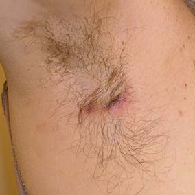 Stadium IIIdiffuse betrokkenheid van een geheel gebied (bijvoorbeeld gehele huid van de oksel), met multipele onderling verbonden fistels of sinussen en abcesvorming