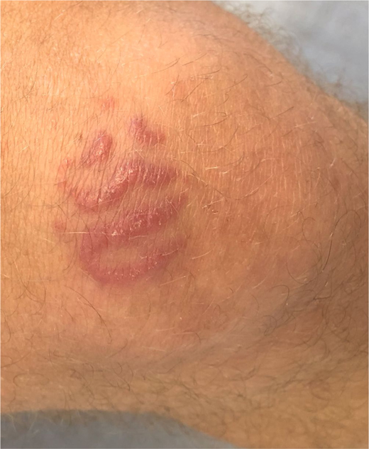 Een 25-jarige man met psoriasis (waarvoor hij zo nodig clobetasolzalf gebruikt) bezoekt zijn huisarts vanwege huiduitslag ontstaan tijdens een vakantie op Bonaire. Hij herinnert zich dat hij tijdens een duiktocht met zijn been langs koraal schaafde. Ongeveer een week later ontstond op deze plek een jeukende rode uitslag. De huisarts ziet op de rechterknie een gebied van 2 x 2 cm met vast aanvoelende erythemateuze plaques, in een opvallende cerebriforme rangschikking [figuur 1]. Hij denkt aan koraaldermatitis en besluit via teleconsultatie de dermatoloog mee te laten beoordelen.