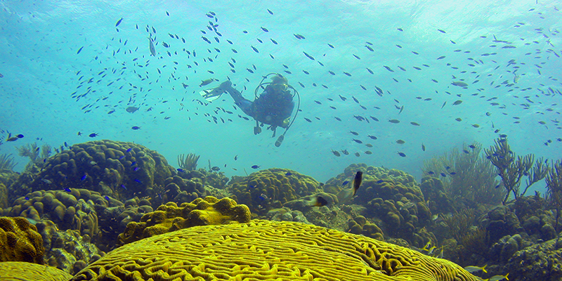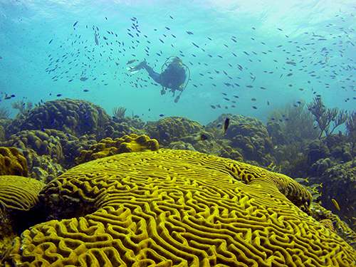 Naast de anamnese van koraalcontact vormt het distributiepatroon van de huidreactie ook een aanwijzing voor koraaldermatitis. Kenmerkend is dat de huidreactie precies beperkt blijft tot het gebied dat daadwerkelijk in contact is gekomen met het koraal, als een exacte afdruk. Een veelvoorkomende koraalsoort is zogenaamd hersenkoraal, dat dezelfde groefstructuur heeft als hersenen met gyri en sulci. Vaak heeft koraaldermatitis daarom eveneens een zogenaamd ‘cerebriform’ uiterlijk, als een stempel van het hersenkoraal.15 Een voorbeeld van hersenkoraal dat veel voorkomt in de zee bij Aruba ziet u in [figuur 2].