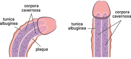 Figuur 1 | Anatomie en plaquevorming die tot kromming leidt bij de ziekte van Peyronie