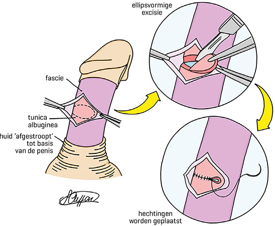 Een verwijzing naar de uroloog voor een operatieve standcorrectie van de penis is pas zinvol in de chronische fase en wanneer vervorming tot ernstige problemen met de coïtus leidt. Dan zijn er verschillende operatieve mogelijkheden [figuur 2-4].15