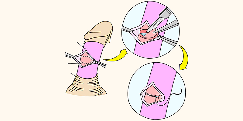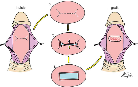 Figuur 3 | Operatieve mogelijkheden bij de ziekte van Peyronie: plaque-incisie of -excisie met grafting (IEG).
