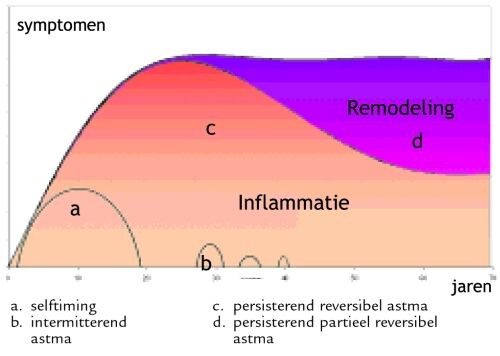 Het staat vast dat het basisprobleem bij astma een chronisch ontstekingsproces van de luchtwegen is, dat afwisselend in een acute en chronische fase kan verkeren. Een ontstekingsproces is een dynamisch fenomeen, waarbij het lichaam ernaar streeft om dit zo snel en efficiënt mogelijk ‘op te ruimen’ en een zo goed mogelijk weefselherstel te bewerkstelligen. Het middel kan echter erger zijn dan de kwaal. Het blijkt namelijk dat naarmate de ontsteking ernstiger is en/of langer bestaat, het herstel met aanzienlijke, vaak niet-reversibele schade van de luchtwegstructuren gepaard kan gaan. Dit proces wordt aangeduid met de term remodeling ( figuur 1).16