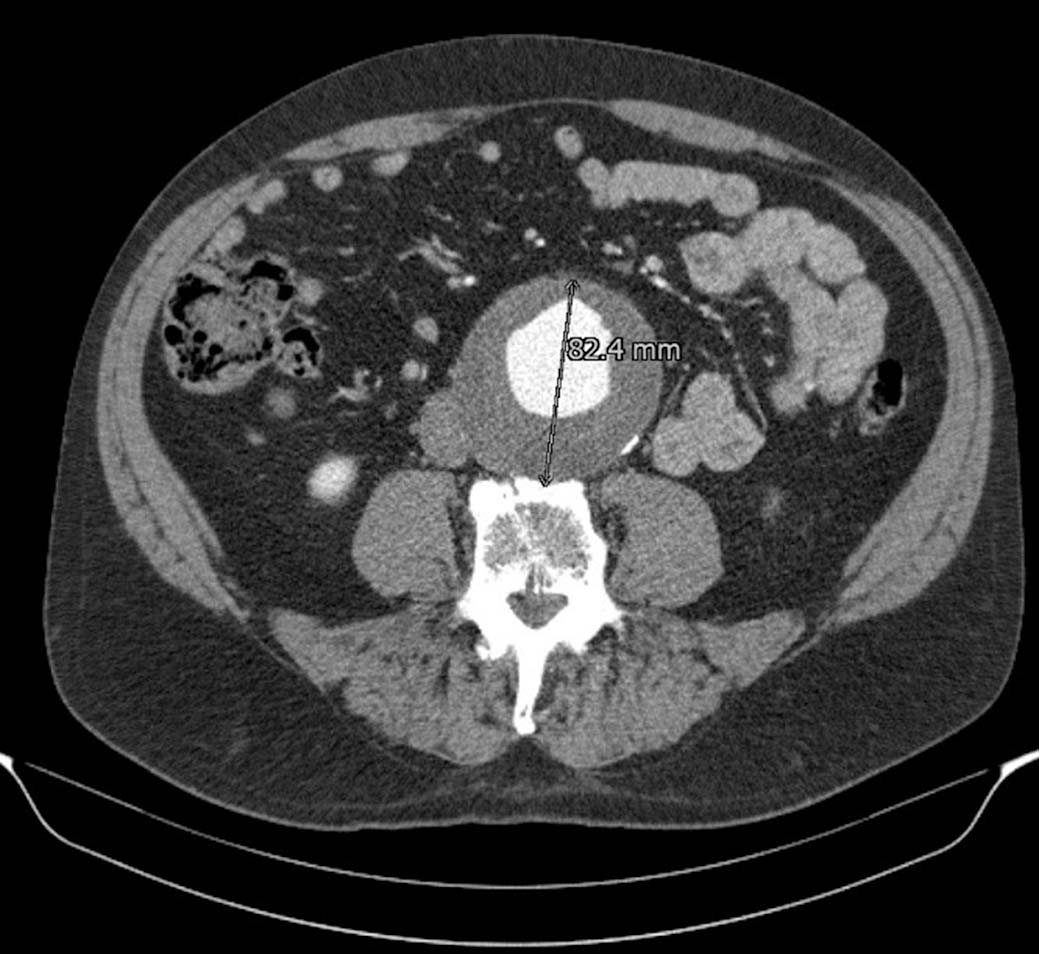 Een 49-jarige man, bekend met hypertensie en sinds enkele jaren gestopt met roken, bezocht in 2013 de spoedeisende hulp in verband met mogelijke nierstenen. Op de CT-scan van het abdomen werd, als toevalsbevinding, een ‘klein’ aneurysma van de buikaorta ontdekt met een diameter van 3,9 cm [figuur 1].