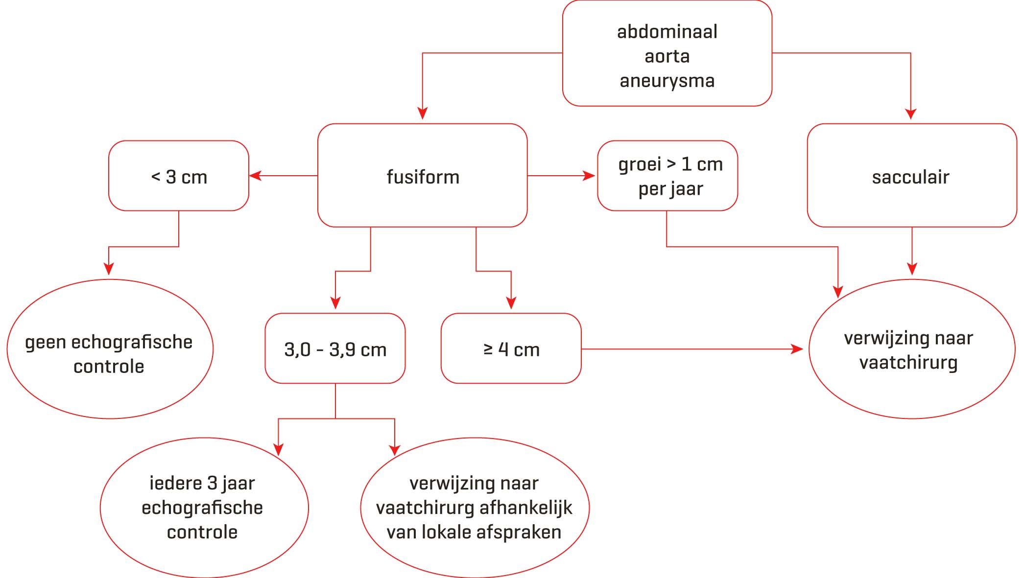Fusiforme AAA’s met een diameter ≥ 4 cm zullen meestal al onder controle staan van de vaatchirurg, afhankelijk van de lokaal gemaakte afspraken.