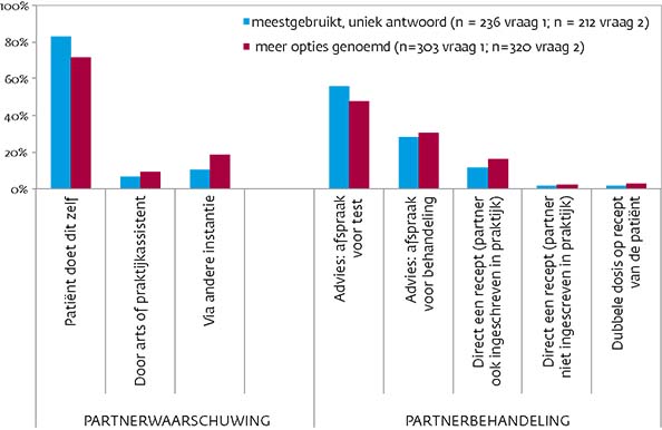 Voor partnerwaarschuwing is de meest toegepaste manier dit te bespreken en verdere stappen aan de patiënt zelf over te laten: 83% kruiste dit als enige antwoord aan (zie vragenlijst en [figuur]). Partnerwaarschuwing door huisarts of praktijkassistente als meestgebruikte methode noemde 7% en door een andere instantie 9%.