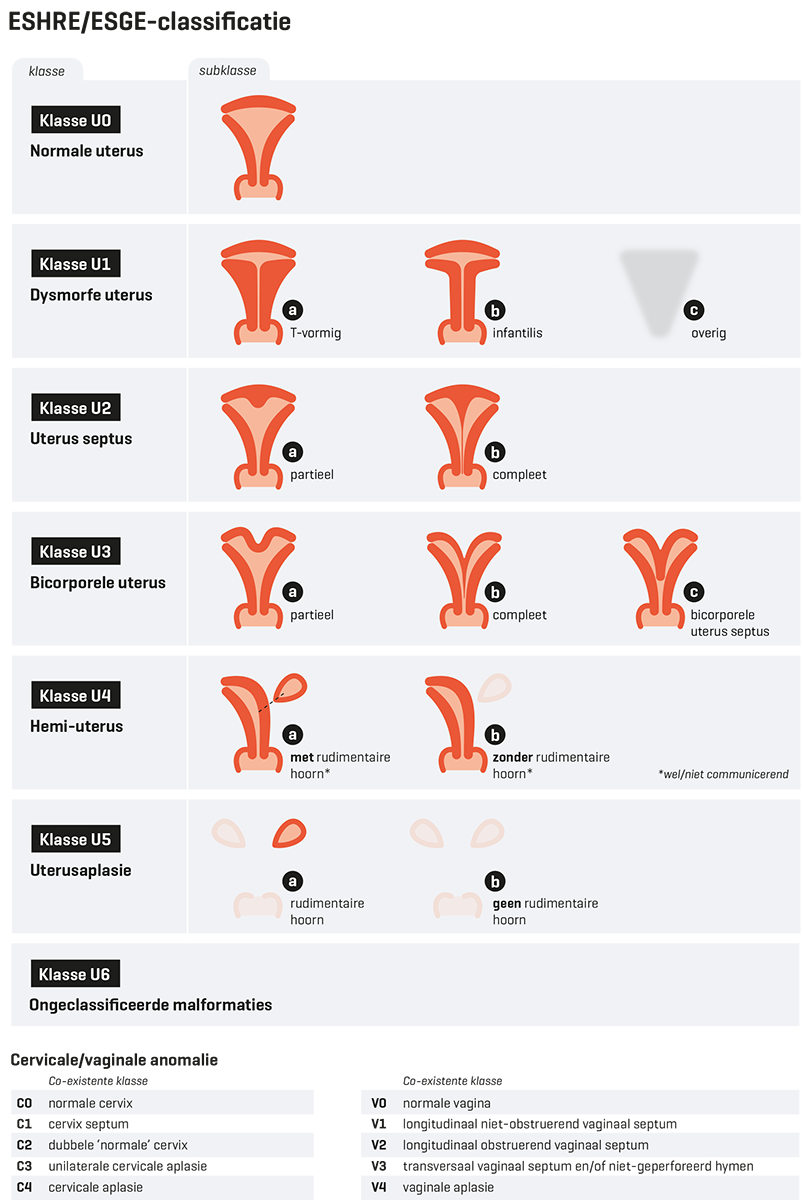 De incidentie van aangeboren afwijkingen van de uterus varieert van 0,5–7% in de algemene bevolking tot 17% bij vrouwen met herhaalde miskramen. 1 , 2 Afwijkingen hoeven niet tot klachten te leiden en kunnen verborgen blijven. De uterus septus is de meest voorkomende afwijking bij vrouwen met infertiliteit. 1 , 2 Congenitale afwijkingen van de uterus kunnen divers zijn en samengaan met afwijkingen aan de cervix en/of vagina, zoals een verdubbeling van de cervix, een longitudinaal vaginaal septum of vaginale aplasie [figuur]. 24 Bij een deel van de vrouwen met aangeboren afwijkingen van de inwendige geslachtsorganen komen ook afwijkingen aan de urinewegen en nieren voor. 2 , 4 , 5