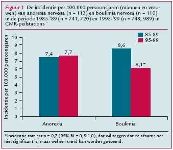 De incidentie van anorexia nervosa is stabiel gebleven (figuur 1). Binnen de groep 15-19 jarige meisjes vonden we echter bijna een verdubbeling (56,4-109,2 per 100.000 persoonsjaren). De p-waarde is 0,05. Mogelijke verklaringen zijn eerdere detectie door huisartsen en grotere bekendheid van eetstoornissen bij het grote publiek. Klinische observaties suggereren dat patiënten op steeds jongere leeftijd anorexia nervosa ontwikkelen. Tegen onze verwachting in liet boulimia nervosa een dalende trend zien (figuur 1).