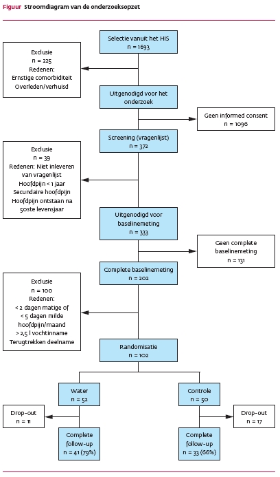 De patiënten waren afkomstig uit 16 gezondheidscentra. We selecteerden patiënten tussen de 18 en 65 jaar die met hoofdpijn, spanningshoofdpijn en/of migraine geregistreerd stonden bij de huisarts (ICPC-codes: respectievelijk N01, N02 en N89). Elke huisarts controleerde deze selectie op overleden of uitgeschreven patiënten en patiënten met te ernstige comorbiditeit. De overgebleven patiënten kregen van de huisarts een uitnodiging om aan het onderzoek deel te nemen. Door middel van een bijgesloten vragenlijst sloten we patiënten met de volgende verschijnselen uit: hoofdpijn minder dan een jaar, secundaire hoofdpijn (als gevolg van een bekende oorzaak), ontstaan van hoofdpijn na het vijftigste levensjaar. De overgebleven patiënten nodigden we uit voor een nulmeting, die bestond uit een hoofdpijndagboek (1 maand) en een vochtinnamedagboek (1 dag). In het hoofdpijndagboek registreerde de patiënt datum en tijdstip van de hoofdpijn, intensiteit van de hoofdpijn (mild, matig, zwaar), eventueel medicijngebruik en eventuele bijkomende symptomen. We includeerden de pa-tiënten als zij ten minste twee episodes van matige hoofdpijn of ten minste vijf milde episodes per maand hadden doorgemaakt. Tevens mocht de maximale vochtinname niet meer dan 2,5 l bedragen.