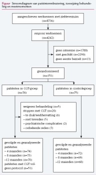 Aan het begin van het onderzoek verschilden de kenmerken van de patiënten die de CGT volgens protocol afmaakten (CGT-voltooiers, n=51) niet van de kenmerken van de patiënten die CGT weigerden of zich terugtrokken uit CGT (CGT-uitvallers, n=25). De klinische uitkomsten en scores op de procesvariabelen van de CGT-voltooiers (n=51) werden vervolgens vergeleken met de scores van de controlegroep (n=75). Er waren geen significante verschillen tussen de groepen.