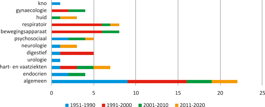 Uit de analyse per orgaansysteem blijkt dat de grootste groep, 22 van de 71 proefschriften (31%), niet een specifiek orgaansysteem betrof [figuur 1]. Van deze 22 proefschriften gingen er 3 over infectieziekten (mazelen, ECHO-virus en tuberculose), 2 over palliatieve zorg, 2 over diverse chronische ziekten en comorbiditeit en 2 over laboratoriumonderzoek. De overige 13 behandelden ziekteoverstijgende onderwerpen zoals het niet-pluisgevoel, richtlijnen, evidencebased geneeskunde, kwaliteit van zorg en verslaglegging van medisch handelen.1113 Kleine specialismen, zoals kno en oogheelkunde, kwamen weinig aan bod. De figuur laat ook zien hoe het interessegebied per decennium verschoof. Hart- en vaatziekten en infectieziekten kwamen in alle decennia aan bod; na 1990 kregen aandoeningen van het bewegingsapparaat en de luchtwegen meer aandacht en vanaf 2000 verschenen er enkele dermatologische onderwerpen. Aandacht voor ziekteoverstijgende onderwerpen, waaronder het niet eenvoudig te onderzoeken niet-pluisgevoel, was er in alle decennia.1314