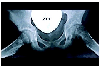 Marja van Wijk, een 12-jarig meisje met blanco voorgeschiedenis komt in augustus 2001 op het spreekuur orthopedie. Sinds oktober 2000 heeft ze last van haar linker heup na een val tijdens handbal. Ze blijft pijn in de heup en lies houden en heeft moeite met lopen. De huisarts schrijft Mensendieck-therapie voor. Drie maanden later wordt er een anteroposterior (AP) röntgenfoto van het bekken gemaakt. Deze wordt als niet-afwijkend beschreven, waarop de huisarts fysiotherapie voorschrijft. De klachten verbeteren tot ze in juni 2001 valt, waarna de klachten hevig verergeren. Het been is dan onbelastbaar; paracetamol helpt. Elf maanden na het ontstaan van de klachten komt ze op het spreekuur orthopedie. De klachten zijn afgenomen, maar ze loopt mank, heeft moeite om na het opstaan op gang te komen en kan maximaal een halfuur lopen. Ze heeft nog geen menarche gehad. Uit lichamelijk onderzoek blijkt dat ze een antalgisch looppatroon heeft met het linker been in exorotatie. De linker heup heeft een passieve flexie van 90° met een positieve Drehman (exorotatie bij flexie) en een opgeheven endorotatie. De functie van de rechter heup is niet afwijkend. Bij röntgenonderzoek van het bekken is zowel op de AP-opname als op de Lauenstein-opname (heup in 90° flexie en maximale abductie) links een ECF zichtbaar ( figuur 1). Deze blijkt achteraf ook op de foto van januari 2001 te zien. Vergeleken met de opname van toen is de afglijding toegenomen.