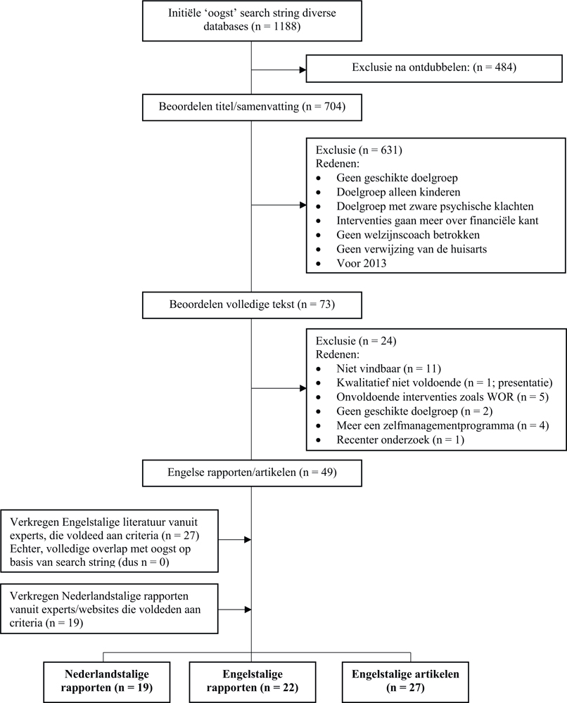 We verzochten alle projecten die zijn aangesloten bij het Landelijk kennisnetwerk WOR om relevante evaluatierapporten aan te leveren. Daarnaast deden we literatuuronderzoek en raadpleegden diverse websites (Loketgezondleven.nl, Movisie, Trimbos Instituut, Google Scholar). Voor het literatuuronderzoek gingen we te rade op Embase, PubMed/Medline, PsycINFO, CINAHL, Web of Science, PROQuest (IBSS, Sociological Abstracts, dissertations). We hanteerden de volgende termen: social efeript*[tiab] OR social efeript*[tiab] OR social efer*[tiab] OR community efer*[tiab] OR non-medical efer*[tiab] OR ‘well being program‘[tiab] OR ‘well being programs’[tiab] OR ‘well being programme’[tiab] OR ‘well being programmes’[tiab] OR ‘wellbeing program’[tiab] OR ‘wellbeing programs’[tiab] OR ‘wellbeing programme’[tiab] OR ‘wellbeing programmes’[tiab]. We beperkten ons tot onderzoeken tussen 2000 en 2018.