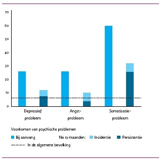 Gezien alle hierboven beschreven onderzoeken lijkt er voldoende bewijs te zijn voor de veronderstelling dat functionele buikpijn en psychische klachten aan elkaar gerelateerd zijn. Nagenoeg alle onderzoeken hebben echter in de tweede of derde lijn plaatsgevonden. Resultaten uit onderzoeken met verwezen kinderen zijn niet zonder meer toepasbaar op de eerste lijn. Het is immers aannemelijk dat verwezen kinderen met functionele buikpijn een selectie zijn van de kinderen die de huisarts ziet. Denk aan selectieve verwijzing op basis van duur en ernst van de buikpijn of misschien zelfs op grond van psychosociale comorbiditeit. Daarom zijn wij in de huisartsenpraktijk nagegaan of kinderen met functionele buikpijn vaker psychische klachten hebben dan kinderen die naar de huisarts gaan met andere huisartsgeneeskundige klachten. Om dit te onderzoeken hebben wij de baselinegegevens gebruikt van ons cohortonderzoek, dat we verderop uitgebreid bespreken. We hebben de baseline-CBCL-gegevens gebruikt van alle kinderen van 6 tot 17 jaar met functionele buikpijn, de patiëntengroep, in totaal 171 kinderen. Als controlegroep hebben we de gegevens gebruikt van kinderen uit de Tweede Nationale Studie naar ziekten en verrichtingen uit de huisartsenpraktijk (NS2).20 Uit de NS2 selecteerden we de kinderen van 6 tot 17 jaar van wie een CBCL bekend was en die voorafgaand aan het invullen daarvan naar de huisarts waren geweest voor een willekeurige huisartsgeneeskundige klacht, anders dan buikpijn. Vierenvijftig kinderen voldeden aan deze selectiecriteria, de controlegroep. De verdeling in sekse en de gemiddelde leeftijd van de patiëntengroep en de controlegroep waren gelijk. Van de patiënten bleek 15,2% een angstprobleem, 28,1% een depressief probleem en 61,4% een somatisatieprobleem te hebben. Somatisatie betekent in dit geval dat een kind te veel functionele klachten heeft. In de patiëntengroep kwamen bepaalde problemen vaker voor dan in de controlegroep: angstproblemen (RR 1,4, 95%-BI 0,6-3,2), depressieve problemen (RR 3,0, 95%-BI 1,3-7,2) en een somatisatieprobleem (RR 8,2, 95%-BI 3,2-21,1).