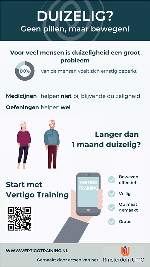 Ondanks de bewezen effectiviteit blijkt uit een vragenlijstonderzoek onder 326 huisartsen in Nederland dat slechts 7% van hen deze oefentherapie toepast. 19 Uit dat onderzoek kwam naar voren dat huisartsen vestibulaire revalidatie niet inzetten, omdat ze niet wisten hoe ze dat moeten doen. 19 Ook zou de behandeling te veel tijd in beslag nemen. Aanvankelijk kregen patiënten voor vestibulaire revalidatie een verwijzing naar gespecialiseerde fysiotherapeuten. Nu is er echter in Nederland een gratis, online zelfhulpmethode beschikbaar. Deze methode, Vertigo Training genaamd, kan de behandeling toegankelijker maken [figuur 1]. Patiënten kunnen zelfstandig, of via een zorgverlener, starten met de zelfhulpmethode op vertigotraining.nl.